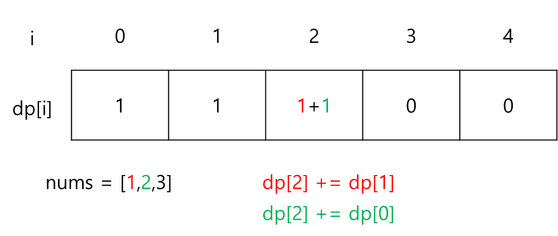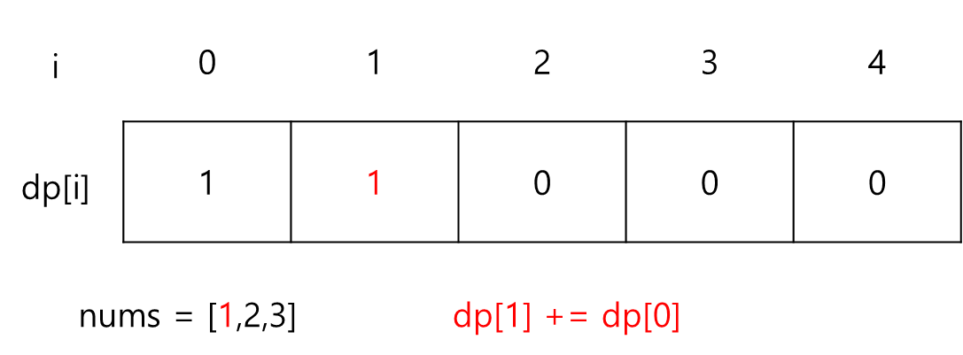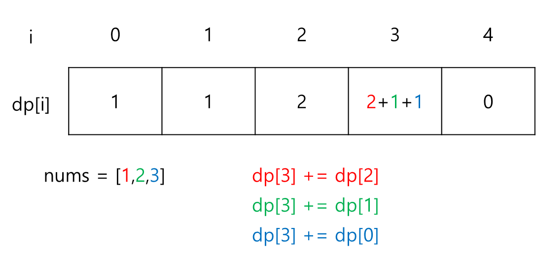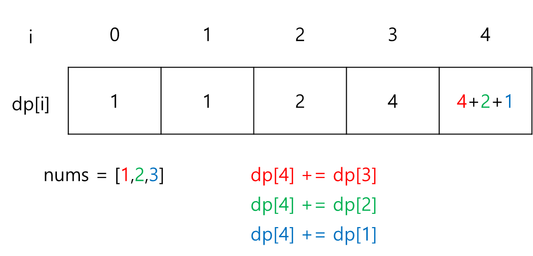 문제에서 주어진 예시처럼 nums=[1,2,3], target=4라 하자. 그럼 위와 같이 dp가 만들어진다.