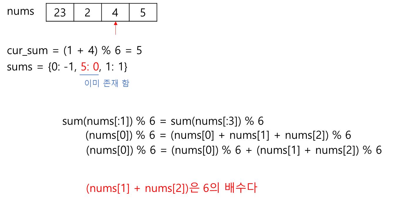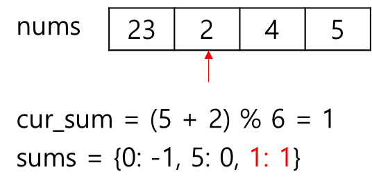 현재(idx)까지 수의 합(cur_sum)을 구해서 그것의 나머지가 이미 sums안에 존재한다면 {cur_sum%k: i}, i부터 idx까지의 합이 k의 배수가 된다.
